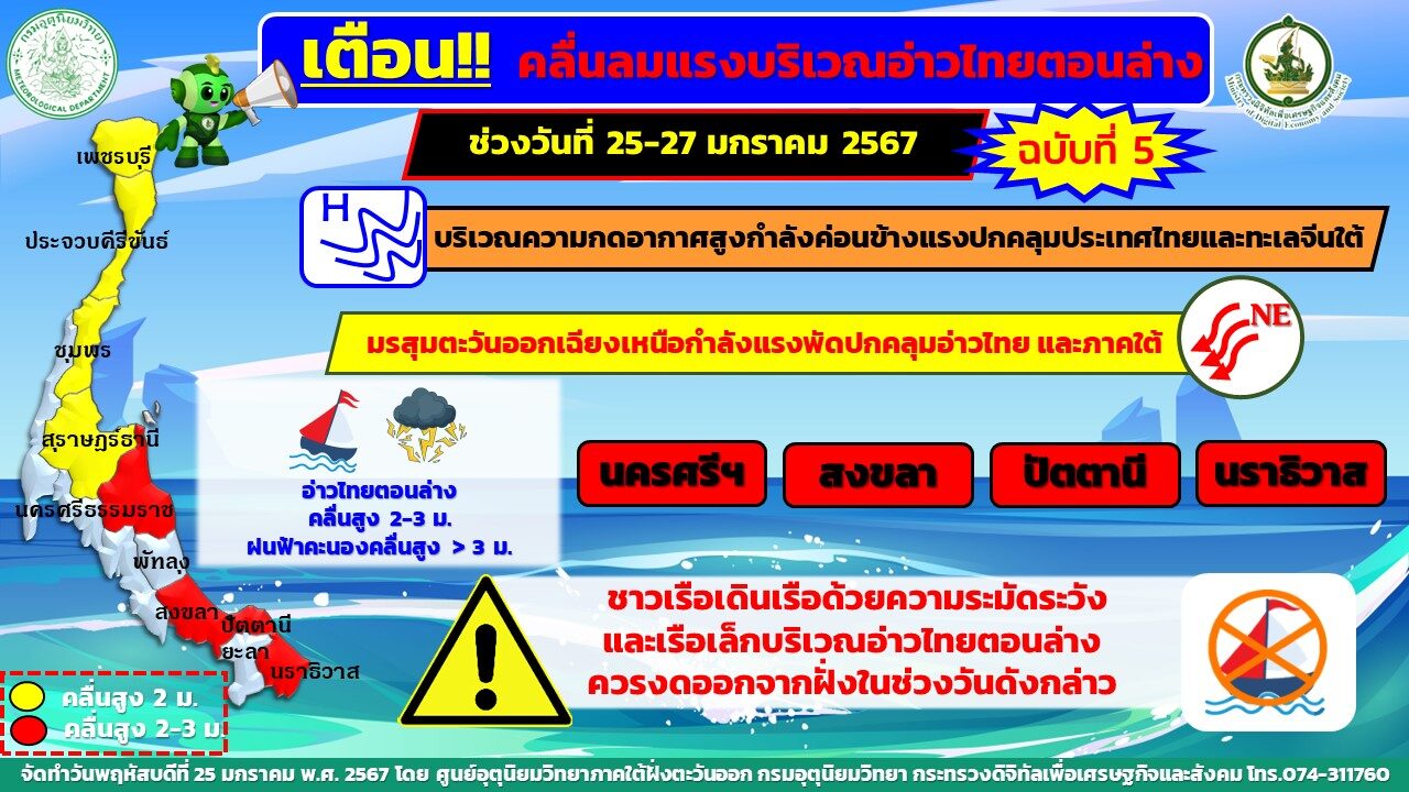 สงขลา ศูนย์อุตุฯใต้ ประกาศฉบับที่ 5 เตือน 4 จังหวัด มรสุมแรงปกคลุมอ่าวไทย เกิดฝนหนักมาก คลื่นสูง 3 ม. เรือเล็กงดออกฝั่ง แจ้งปชช.ติดตามใกล้ชิด ระหว่าง 25-27 ม.ค. 67